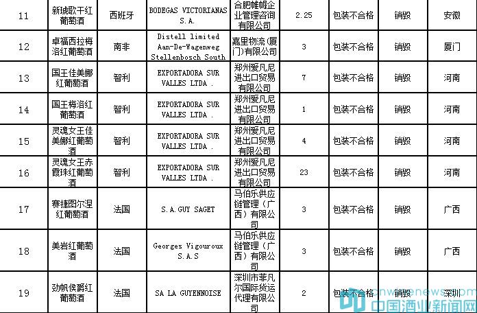 值得注意的是,不合格進(jìn)口葡萄酒中,包裝不合格占65%,有15批次,均被銷毀。另外,還有4批次來自澳大利亞的,進(jìn)口商為廈門國貿(mào)集團(tuán)股份有限公司,生產(chǎn)商為BW Fitzgerald & Penhall Investments Pty Ltd T/A Nannup Ridge Estate的葡萄酒因標(biāo)簽不合格,在廈門口岸被退貨。