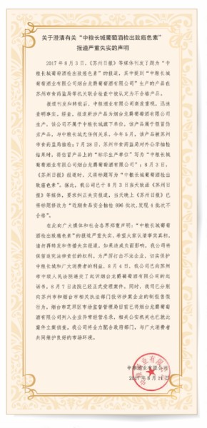 8月3日,多家媒體刊發(fā)了題為“中糧長城葡萄酒檢出致癌色素”的報(bào)道,其中提到“中糧長城葡萄酒業(yè)有限公司煙臺(tái)龍爵葡萄酒有限公司”生產(chǎn)的產(chǎn)品在蘇州市食藥監(jiān)局等機(jī)關(guān)聯(lián)合檢查中被認(rèn)定為不合格產(chǎn)品。