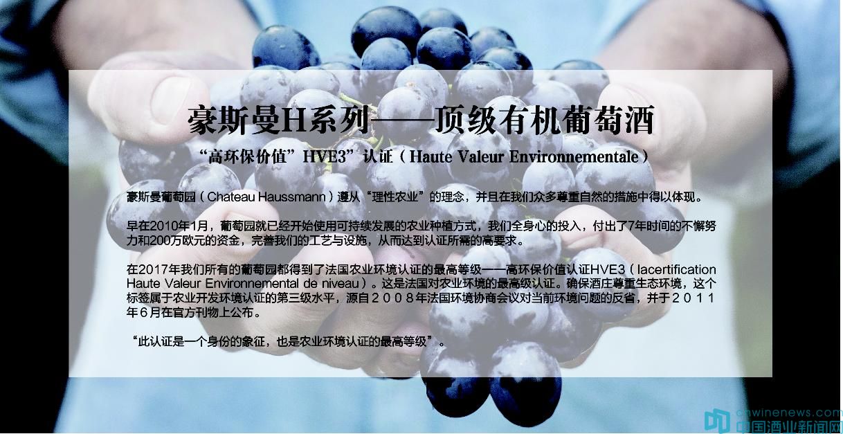 在2017年豪斯曼所有的葡萄園都得到了法國農業環境認證的最高等級——高環保價值認證HVE3(lacertification Haute Valeur Environnemental deniveau),此認證是一個身份的象征,也是農業環境認證的最高等級。高環保價值從6個方面評估企業及其經營活動在環保方面的整體表現:限制使用病蟲害藥劑、保護水資源、施肥管理、保護生物多樣性、廢棄物處理與再利用、能源管理。