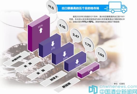 截至2020年3月底的12個月中,澳大利亞葡萄酒的出口總額增長了3%至28.7億澳元,瓶裝葡萄酒的平均出口價達到了7.12澳元/升(離岸價)。