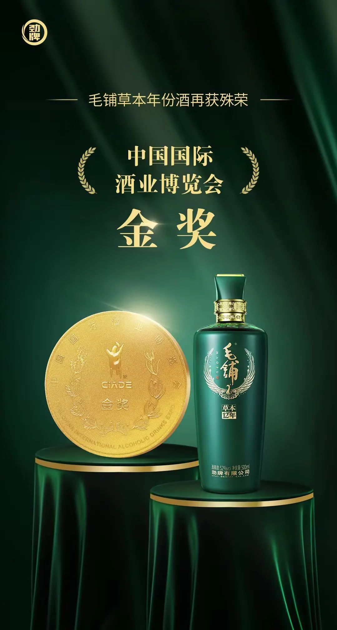 10月12日,在第十九屆中國國際酒業博覽會上,勁牌養生一號、毛鋪草本年份酒12年雙雙獲得“金獎”。